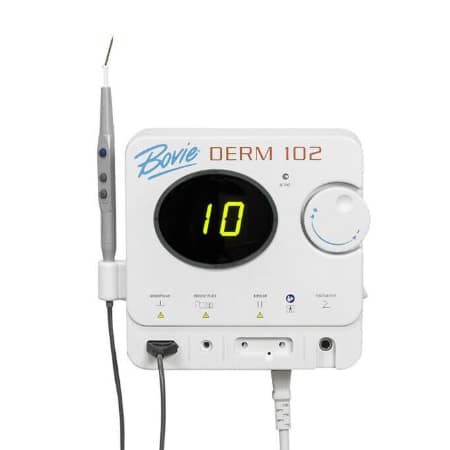 Most procedures performed by a High Frequency Desiccator utilize ten watts of power or less. The Derm 102 are economical, 10 watt high frequency desiccators, thoughtfully designed to give practitioners the ability to perform in-office, minor skin procedures such as the removal of skin tags, benign lesions and premalignant lesions. These Bovie units allow practitioners to provide better patient care in the office, at a sensible price, saving the patient time and money, while increasing their practice revenue.