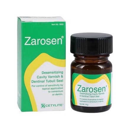 Zarosen Cavity Varnish is a Strontium-based desensitizer that penetrates, fills and seals tubuli with a desensitizing agent. Simply apply directly to cementum, dentin, or the enamel tooth structure. It is universally compatible with all restorative enamel materials and is cost effective.
