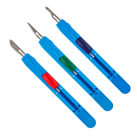 Medi-Cut Safety Scalpels from Dynarex are allow for precision incisions while providing superior safety features. These instruments feature a retractable blade that can be permanently locked inside the handle once it is no longer needed. Each one is crafted from stainless steel with durable plastic handles.