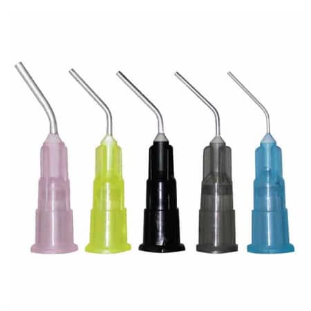 Multipurpose Prebent Dispensing Tips from Henry Schein are designed for placing etchants, sealants, cements and other flowable materials. They feature blunted ends for greater patient comfort and are universally color-coded for easy identification.