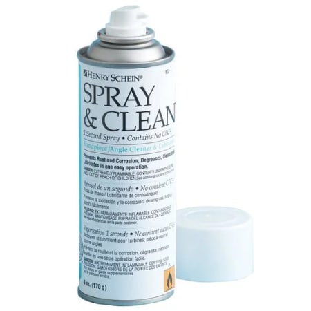Spray & Clean Handpiece Lubricant from Henry Schein is designed to keep your equipment in prime working order. This single-step cleaner and lubricant minimizes the wear caused by metal on metal movement while also helping to prevent corrosion. The synthetic lubricant resists breaking down during sterilization for longer lasting protection.