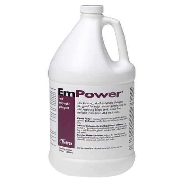 EmPower is used to pre-clean critical or semi-critical medical devices prior to terminal sterilization or high level disinfection. It contains two protease enzymes that offer the broadest cleaning action on a variety of protein soils. Inclusion of surfactants provides additional cleaning on carbohydrates, lipid and protein soils. Works fast to remove blood, tissue, mucous and other protein rich bodily fluids from instruments.