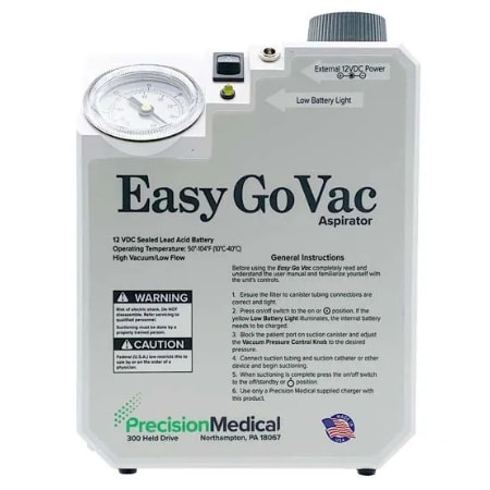 The EasyGoVac from Precision Medical is a portable, battery-powered aspirator that provides continuous suction power to remove respiratory fluids. Each one can run for 2 hours of constant use while delivering up to 483mmHg of vacuum power. These units also feature low-battery lights to make users aware when the unit is in need of recharging. The closed design makes is easy-to-clean and helps fight against bacterial growth. This, combined with other safety features such as a float shut-off and an inline hydrophobic filter, works to prevent overflow and keep contaminants from entering the pump