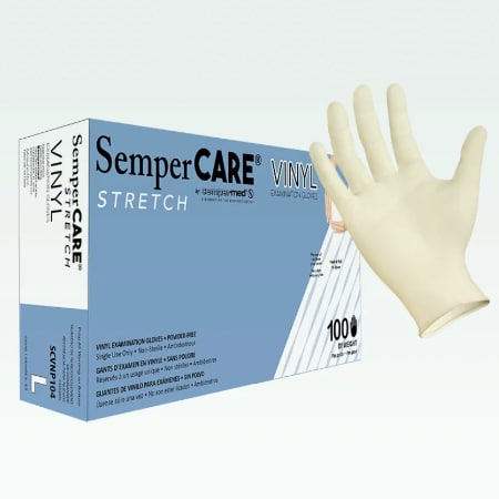 SemperCare Stretch vinyl exam gloves from Sempermed are the low cost alternative that fit and feel like latex. Due to their superior manufacturing process, these gloves deliver increased elasticity and superior stretch when compared to traditional vinyl. Each one features a smooth surface to provide maximum tactile sensitivity while working with delicate instruments.