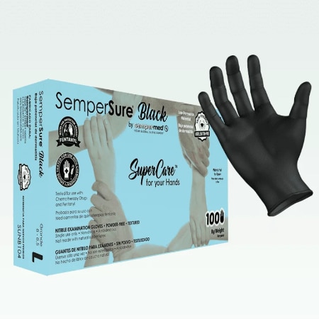 SemperSure Black nitrile exam gloves from Sempermed are designed for those with skin sensitivities to regular nitrile gloves. They are accelerator-free, eliminating the sulfur-based chemicals that can cause skin irritation. Each one features textured fingertips for a superior grip in wet or damp conditions and they are easy to don thanks to their chlorinated interior. These gloves have passed testing for use with select Chemotherapy drugs and are resistant to Fentanyl.