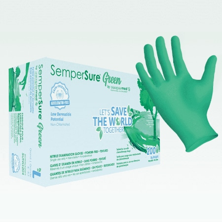 SemperSure Green nitrile exam gloves from Sempermed are designed for those with skin sensitivities to regular nitrile gloves. They are accelerator-free, eliminating the sulfur-based chemicals that can cause skin irritation. Each one is made using sustainable manufacturing practices, requiring less water and energy to produce while creating less CO2 emissions. These gloves feature textured fingertips for a superior grip in wet or damp conditions and have passed testing for use with select Chemotherapy drugs.