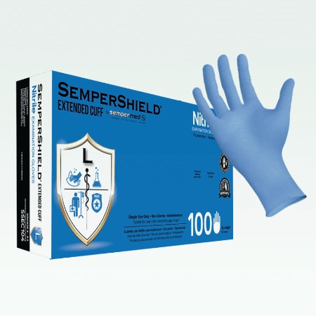 SemperShield Extended Cuff nitrile exam gloves from Sempermed are designed to provide increased protection in high-risk situations. Each one is made thicker than standard gloves and includes textured fingertips to help ensure a superior grip in wet or damp conditions. These gloves have also been found to provide an effective barrier against exposure to select chemotherapy drugs and fentanyl.