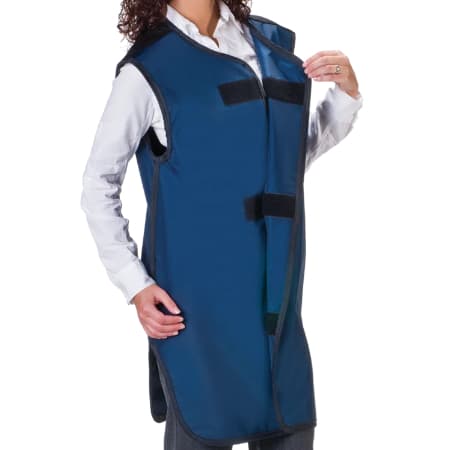 The weight of the Wolf X-Ray Front Closing Special Procedure Aprons is distributed across the shoulders while comfort is enhanced by an adjustable belt. The FCSP Apron has a full back panel for all-around protection and is held closed by three hook-n-loop tabs.